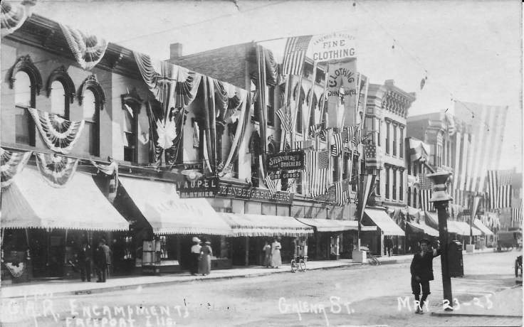 Photo postcard of the Vaupel Clothier storefront on Galena Street in Freeport, Illinois during the 44th Grand Army of the Republic (Civil War Veterans) Encampment. Note the hanging banner shaped like a pair of trousers in the middle of the street labelled “Clothing – John Vaupel”. John Vaupel was the brother of Christina Vaupel Blumenstiel and great-uncle of Dorothy Blumenstiel Jarrell.