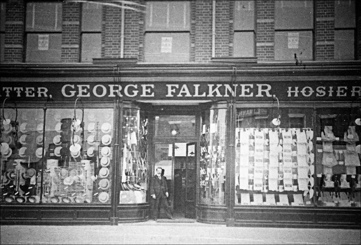 George Ernest Falkner, Sr. opened this men’s clothing and furnishings shop in Balham Hill, London, England around 1900. Unfortunately, it was not successful and George subsequently filed for bankruptcy. He relocated to Toronto, Canada where he met and married his wife, Florence Jones Falkner. They had two children: Emma May Falkner and George Ernest Falkner, Jr..