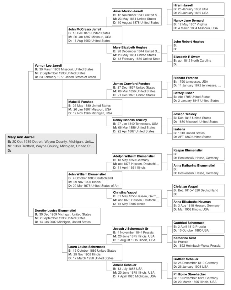 A genealogy chart is a work-in-progress, always changing as new discoveries are made and old information is updated. Below is the current chart for Mary Ann Jarrell, daughter of Dorothy Blumenstiel Jarrell and Vernon Lee Jarrell.