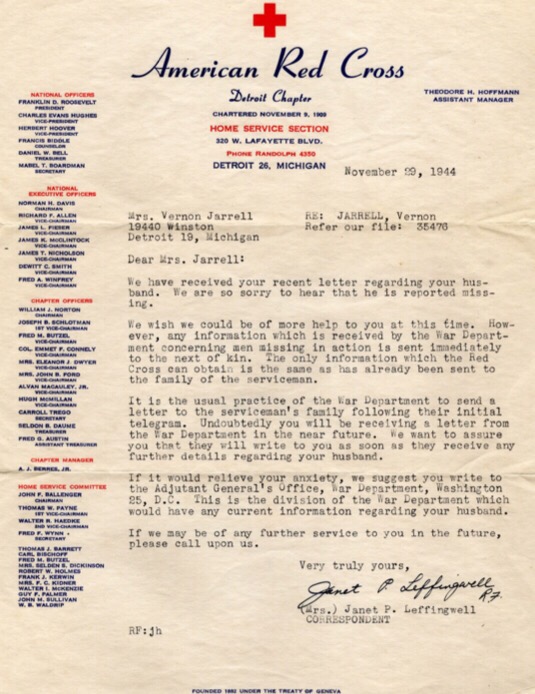 Vernon Lee Jarrell, US Army WWII (1944-45). Vernon Lee Jarrell was reported “missing in action” in France November 5, 1944. His whereabouts were unknown for several weeks and his wife, Dorothy Blumenstiel Jarrell, contacted the War Department and Red Cross in an attempt to get information. #wwii #wwiihistory #illinois #jarrellgenealogy #familyhistory #genealogy #familyarchives #familyarchive #falknerjarrell #usarmy #usarmyinfantry #pow #prisonerofwar