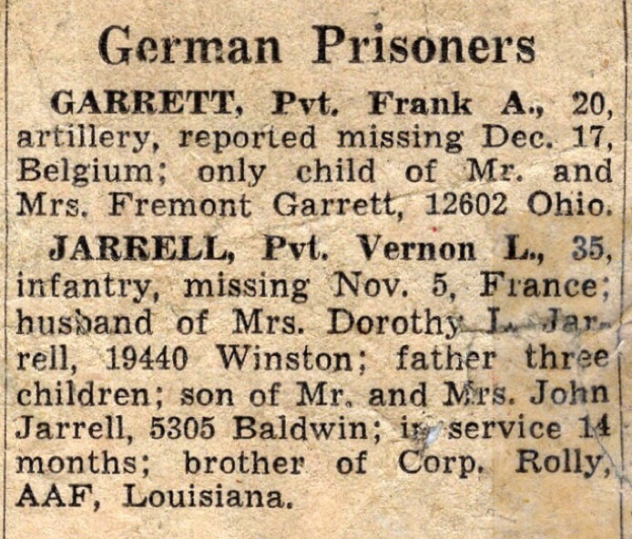 Vernon Lee Jarrell, US Army WWII (1944-45). Vernon Lee Jarrell was reported “missing in action” in France November 5, 1944. His whereabouts were unknown for several weeks and his wife, Dorothy Blumenstiel Jarrell, contacted the War Department and Red Cross in an attempt to get information. #wwii #wwiihistory #illinois #jarrellgenealogy #familyhistory #genealogy #familyarchives #familyarchive #falknerjarrell #usarmy #usarmyinfantry #pow #prisonerofwar