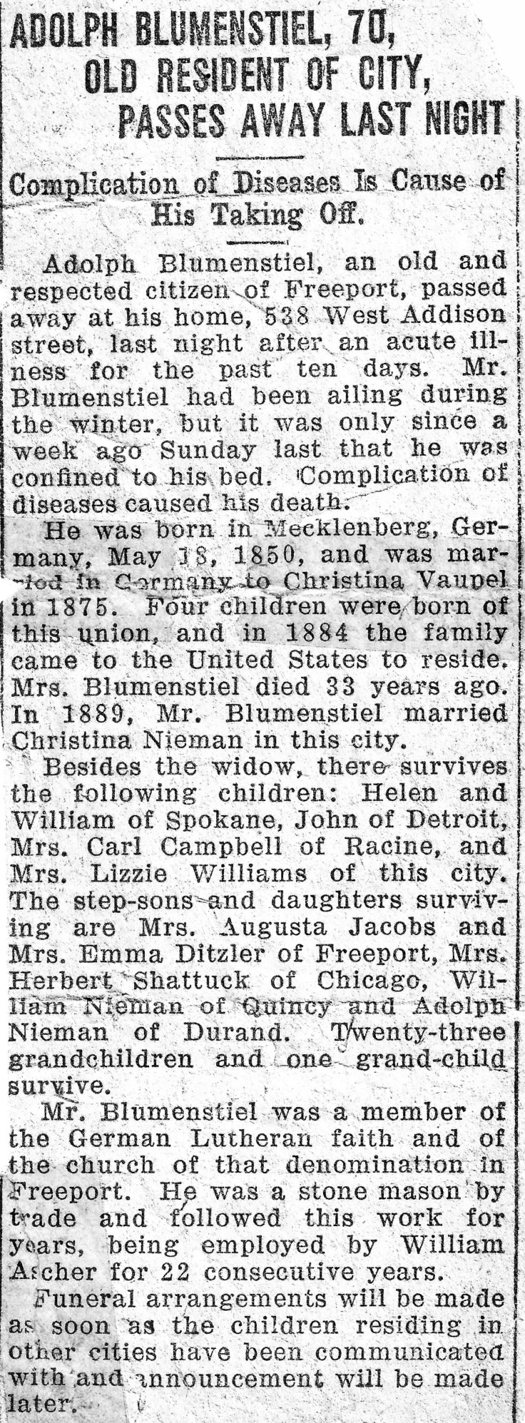 Adolph Wilhelm Blumenstiel Obituary (1850-1921). Adolph Wilhelm Blumenstiel was the paternal grandfather of Dorothy Blumenstiel Jarrell and father of John William Blumenstiel. He was a stone mason and worked for William Ascher, a builder in Freeport, Illinois, USA for many years. #falknerjarrell #blumenstielgenealogy #freeportillinois #illinois #illinoishistory #familyhistory #genealogy #germany #familyphotos #ancestry #history #knowyouroots #family #ancestor #genealogyresearch #geneabloggers #familytree #familyhistorian #findyourroots #traceyourroots #genealogia #familyarchives #obituary #blumenstiel