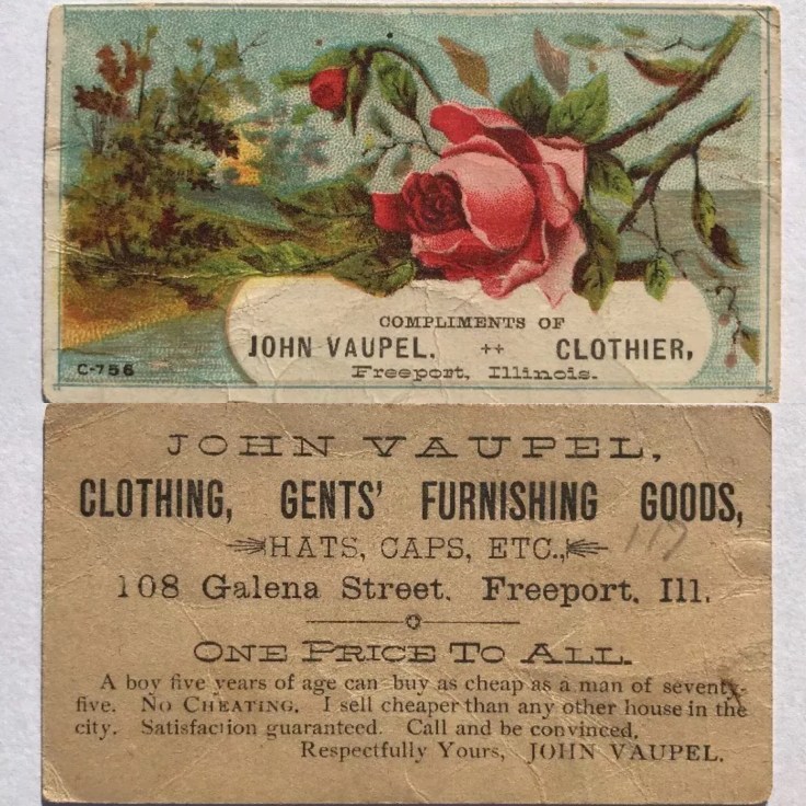John Vaupel Clothier, business card. 108 Galena St. Freeport, Illinois, USA. John Vaupel was the brother of Christina Vaupel Blumenstiel and great-uncle of Dorothy Blumenstiel Jarrell. #genealogy #familyhistory #freeportillinois #falknerjarrell #vaupelgenealogy #oldphotos #storefront #clothingstore #johnvaupel #johnvaupelclothier #vaupel #businesscards #businesscard #vintageadvertisement #advertisement #illinois #illinoishistory #clothingstore #manclothes #manclothing #gentleman #haberdashery #advertisingcards #advertisingcard #victoriantradecards #menswear