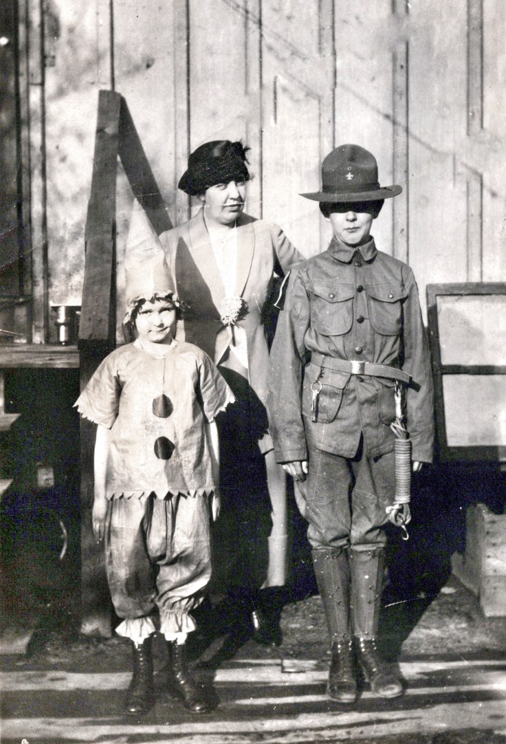 Laura Schermack Blumenstiel (back) and children, Dorothy Blumenstiel Jarrell and Donald William Blumenstiel (circa 1915-1920). Dressed for Halloween. #falknerjarrell #blumenstielgenealogy #blumenstiel #familyhistory #genealogy #familyphotos #oldphotos #oldphoto #detroit #detroithistory #michigan #michiganhistory #familyhistory #familyhistorian #schermackgenealogy #schermack #halloween #clown #clowns #army #boyscouts #boyscoutsofamerica #halloweencostume #halloweencostumes