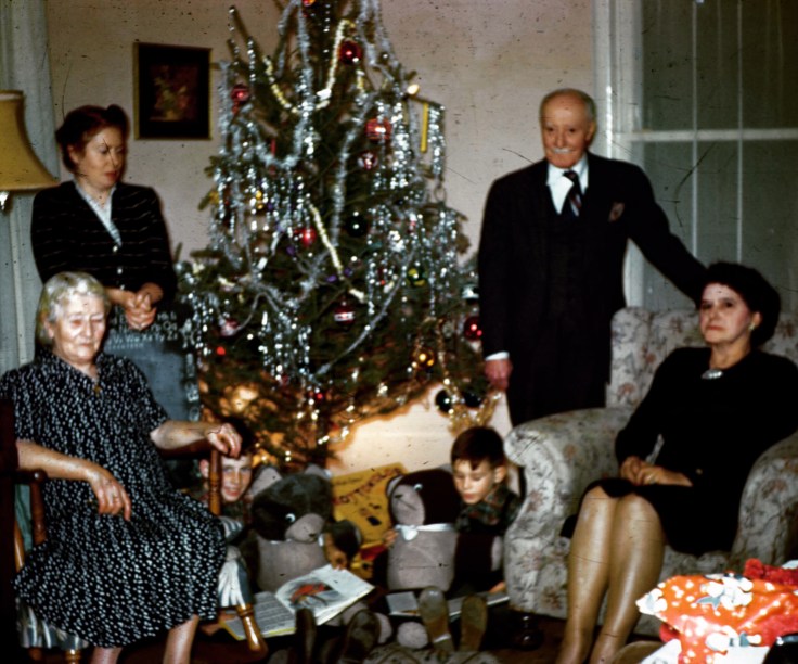 Christmas at my Falkner grandparents’ home in Redford, Michigan, USA (circa 1944). Left: Grandmother, Agnes Carney Falkner (standing) with her mother, Julia Grady Carney. Right: Great-grandfather, George Ernest Falkner, Sr. (standing) with unknown woman (possibly his third wife, Estella Rook). My uncle, Ronald (left), and father, Patrick Falkner, are seated in front of the tree. This scan is from a color slide. #falknerjarrell #ancestors #familyhistory #genealogy #genealogyphoto #ancestry #history #knowyouroots #antiquephotograph #family #vintagephotography #oldphotos #oldphoto #ancestor #antiquephoto #genealogyresearch #geneabloggers #oldphotograph #savinghistory #findingroots #falknergenealogy #carneygenealogy #falkner #carney #christmas #christmastree #redfordmi #detroit #familychristmasphoto