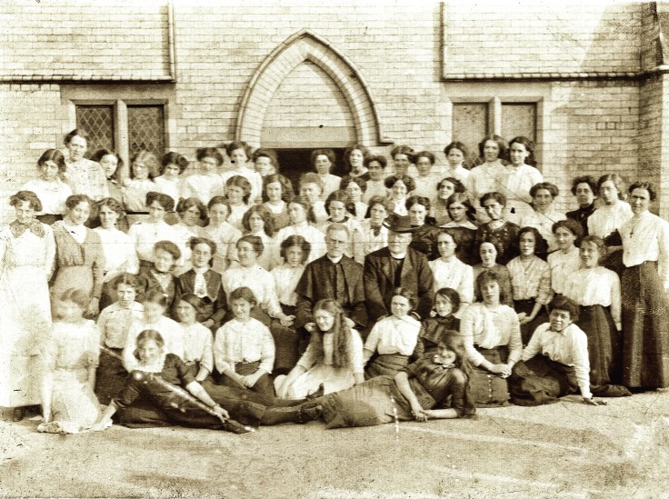 Kathleen Carney School/Church Photo, Early 1900s. She was the sister of Agnes Carney Falkner and my great-aunt. She is behind the left shoulder of the hatted priest, dressed in black. Kathleen later became a nun, Sister Mary St. Edmund at St. Paul’s Convent, Selly Park, Birmingham, UK. The location/church is ubknown, but the family lived in Widnes, Lancashire, UK. #falknergenealogy #carneygenealogy #falknerjarrell #carney #familyhistory #genealogy #familyphotos #oldphotos #lancashire #england #convent #nun #sister #catholicnun #catholic #catholicchurch #convent #birmingham #birminghamuk #stpaulsconvent #sellypark #religious #widnes #schoolphotos #classphoto #schoolphoto #classphotos #churchphotography #churchphotos #girls
