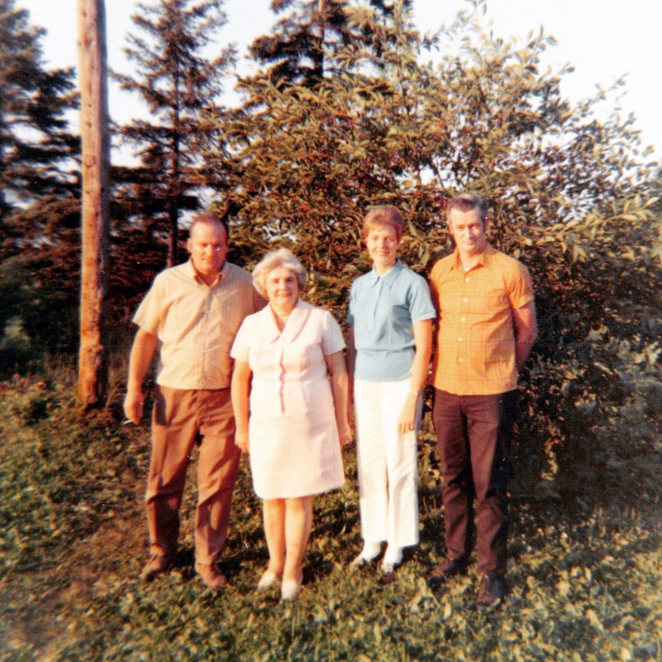 Callaghan/Falkner Cousins (1969). Reg and Irene Chuliner Callaghan (left) with my parents, Patrick and Mary Ann (Cookie) Falkner in Campellton, New Brunswick, Canada. Patrick was the son of Irene’s first cousin, Agnes Carney Falkner and grandson of Julia Grady Carney. #falknergenealogy #falkner #gradygenealogy #grady #chulinergenealogy #chuliner #carneygenealogy #carney #newbrunswickcanada #newbrunswick #campbellton #campbelltonnb #familyhistory #genealogy #familyphotos #ancestry #history #1960s #family #vintagephotography #oldphotos #oldphoto #ancestor #antiquephoto #genealogyresearch #geneabloggers #familytree #familyhistorian #genealogia