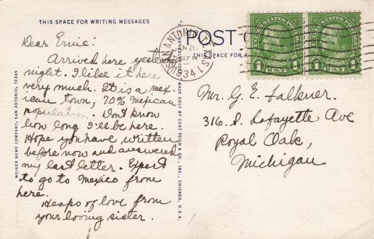 Postcard from Emma May Falkner Alfaro to her brother, George Ernest “Ernie” Falkner, Jr. (26 January 1934). “Aunt May” was a New York-based dancer in Texas for work. She tragically died of typhoid fever in San Antonio in July, 1934 at the age of 25. This is the last communication we have from her. #falknerjarrell #falknergenealogy #falkner #familyhistory #genealogy #familyphotos #oldphotos #royaloakmi #michigan #dancer #flamenco #dance #newyorkcity #newyork #typhoid #typhoidfever #sanantonio #texas #genealogia #genealogie #genealogía #genealogist #tragedy #tragicdeath #postcard #lastwords #sister #death