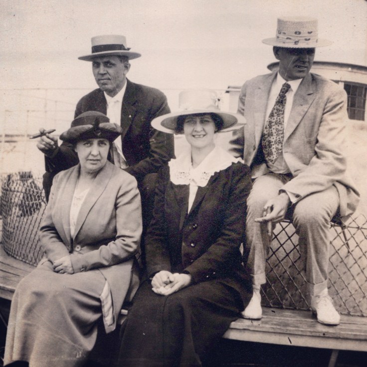 Alma Schermack Feneley (front left) in front of husband, Charles Feneley, with friends. Aunt Alma was my great-great aunt, who I knew as an old woman in the 1970s. They relocated from Freeport, Illinois, USA to Detroit, Michigan, USA along with her siblings, in the early 1900s. #falknerjarrell #schermackgenealogy #schermack #freeportillinois #illinois #familyhistory #genealogy #familyphotos #oldphoto #oldphotos #illinoishistory #sisters #detroit #detroithistory #michigan #michiganhistory #strongwomen #hats #1900s #womeninhats #women #womensfashion #feneley #hats #aunt #greatgreataunt #relocation #boaterhat #boater #meninhats