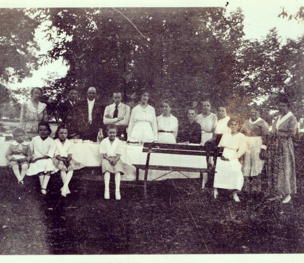 Schermack/Blumenstiel Family (circa 1915). The woman in black, center row, is my great-great grandmother, Amelia Schauer Schermack. The children seated in the front row include my grandmother, Dorothy Blumenstiel Jarrell, at center, with my great-aunt, Margaret Blumenstiel Holmes, to the left, followed by their cousin, Florence Schermack. I can identify various other family members, such as great-great aunt Anna Schermack, back row left, next to her brother, Alfred Henry Schermack. Unfortunately, this is a small snapshot and the resolution is poor when the size is increased. #falknerjarrell #blumenstielgenealogy #blumenstiel #familyhistory #genealogy #familyphotos #oldphotos #oldphoto #detroit #detroithistory #michigan #familyhistory #familyhistorian #sisters #sister #ancestors #ancestor #ancestry #familyphoto #cousins #schermackgenealogy #schermack #1910s #greatgrandparents #grandparents #greatgreatgrandma #greatgreatgrandmother #picnic #familypicnic
