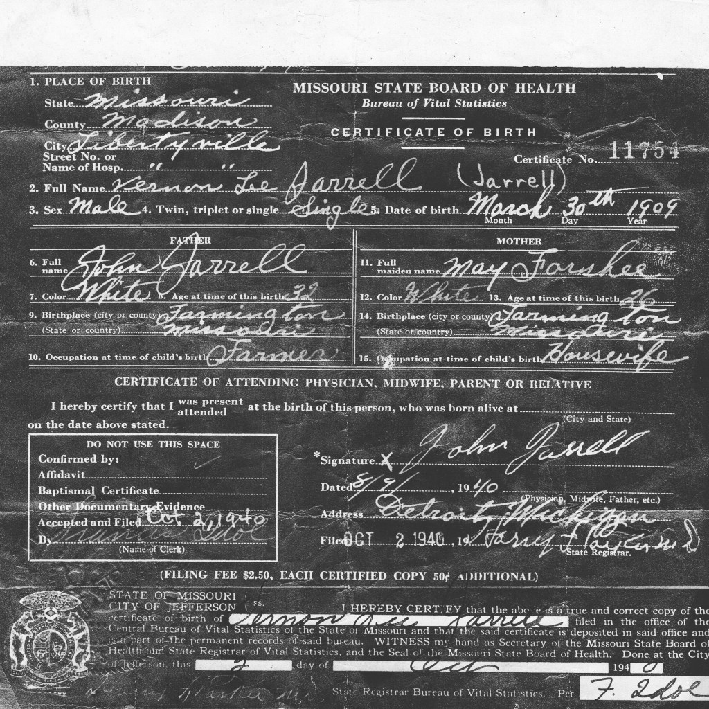Birth certificate for Vernon Lee Jarrell, my maternal grandfather. There was no formal birth certificate from his birth in 1909, so this was generated in 1940, based on his father’s sworn statement. #falknerjarrell #familyhistory #genealogy #familyphotos #ancestry #history #knowyouroots #family #vintagephotography #oldphotos #oldphoto #ancestor #genealogyresearch #familytree #familyhistorian #findyourroots #traceyourroots #genealogia #familyarchives #jarrellgenealogy #jarrell #ancestors #lovefamilyhistory #family #missouri #madisoncountymo #birthcertificate #birthcertificateattestation