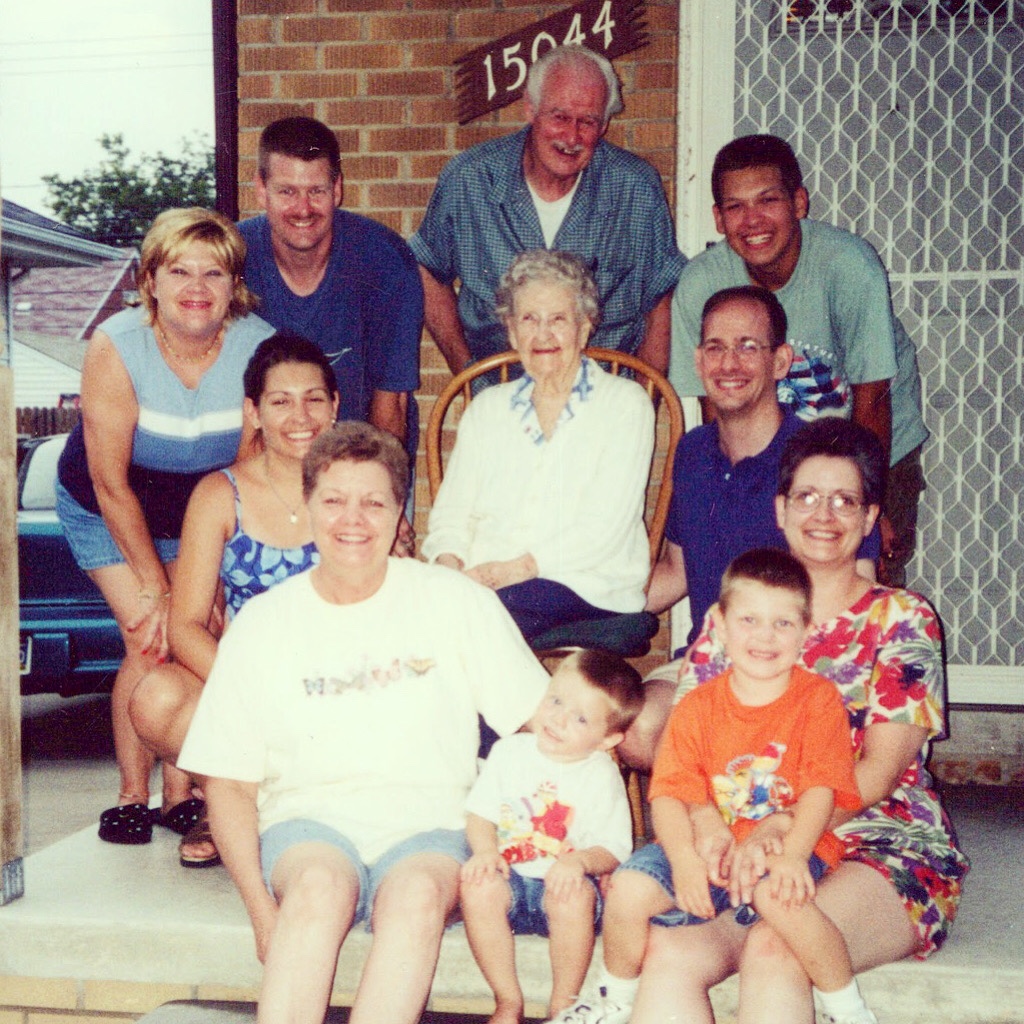 Four generations photo. Patrick and Mary Ann Falkner family (about 2000). We are surrounding my maternal grandmother, Dorothy Blumenstiel Jarrell. Grandma was having trouble walking, so we picked up her chair and transported her to the porch, with her laughing all the way. Clockwise from lower left: Mary Ann Jarrell Falkner, Stephanie Rujan Barritt, Berverly Kerekes Falkner, Mike Falkner, Patrick Falkner, Brian Rujan, Craig Falkner, Kathy Falkner Rujan, Michael Falkner, and Jake Falkner. Taken in Allen Park, Michigan, USA. #falknerjarrell #ancestors #familyhistory #genealogy #genealogyphoto #ancestry #history #knowyouroots #family #vintagephotography #genealogyresearch #vintagephoto #savinghistory #findingroots #falknergenealogy #falkner #jarrellgenealogy #jarrell #rujan #kerekes #1960s #savefamilyphotos #savefamilymemories #allenpark #michigan #familyphoto #familygroup #4generations #fourgenerations #4generation