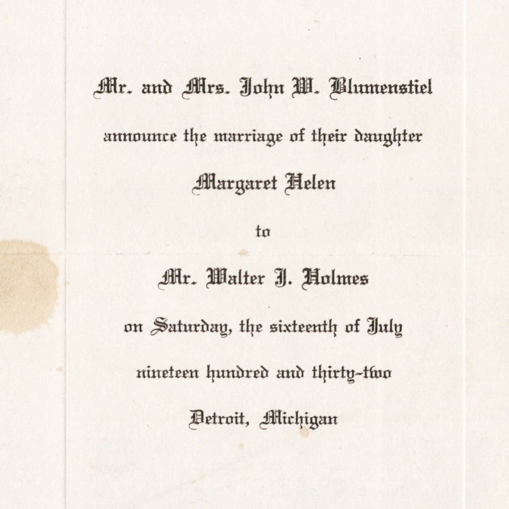 Wedding invitation of my great aunt and uncle, Margaret Helen Blumenstiel and Walter John Holmes (1932). #falknerjarrell #blumenstielgenealogy #blumenstiel #familyhistory #genealogy #familyphotos #oldphotos #oldphoto #detroit #detroithistory #michigan #michiganhistory #familyhistory #familyhistorian #ancestors #ancestor #ancestry #familyphoto #1930s #weddinginvitation #weddingannouncement #wedding #nuptials #greataunt #greatuncle