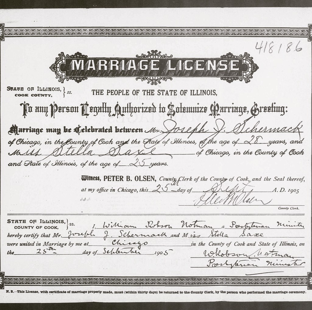 Marriage license of my great-great uncle and aunt, Joseph J. Schermack, Jr. and Stella Saxe (1905). He was an inventor of mailing machines, vending machines and other devices. According to a Scientific American article in 1929, “he has done more to make automatic vending a commercial success than any man in this country”. He is most associated with postage stamp vending machines and private stamp perforations made for use in his devices. He was born in Freeport, Illinois, USA and moved to Detroit in 1906 to found the Schermack Mailing Machine Company (later called the Mailometer Company). He ultimately focused on vending machines, founding various companies, including Schermack Products Corporation. #familyhistory #detroit #detroithistory #schermackcompanies #schermackgenealogy #stampvendingmachine #stampcollection #stampcollector #genealogy #falknerjarrell #vending #vendingmachines #schermack #josephjschermack #inventor #inventions #patent #scientificamerican #automaticvendingmachine #marriagelicense #greatgreatuncle
