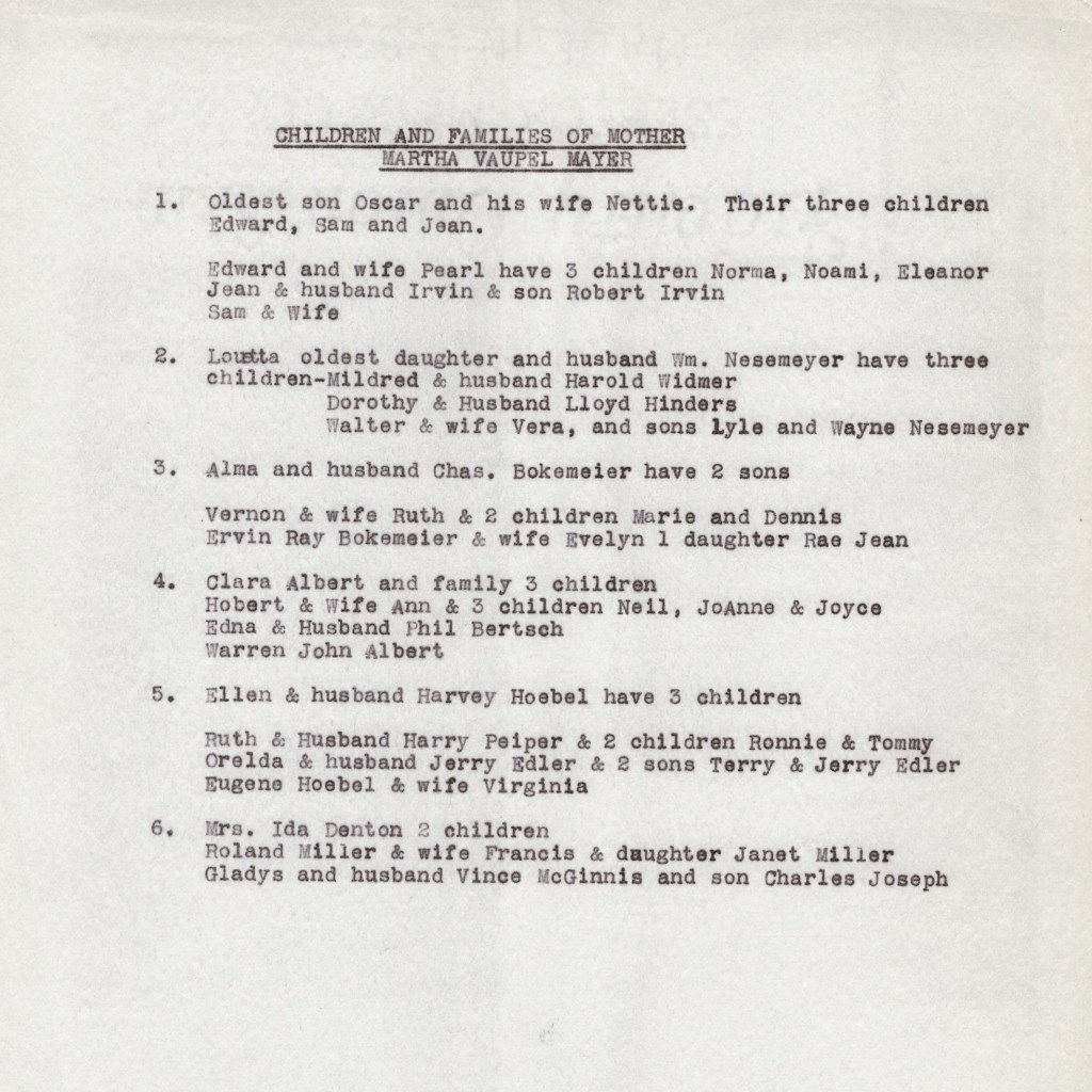 Children and families of Martha Vaupel Mayer of Freeport, Illinois, USA. This was compiled by my great-grandfather, John William Blumenstiel, and listed his maternal aunt’s family members. Martha was the sister of my 2x great-grandmother, Christina Vaupel Blumenstiel. She died in 1961, at the age of 103, which was uncommon for the time. The Blumenstiel/Vaupel family immigrated to Freeport from Reichensachsen, Hessen in the 1880s. #falknerjarrell #vaupelgenealogy #vaupel #mayergenealogy #mayer #freeportillinois #illinois #familyhistory #genealogy #familyphotos #ancestry #knowyouroots #vintagephotography #oldphoto #ancestor #antiquephoto #genealogyresearch #familytree #familyhistorian #findyourroots #traceyourroots #genealogia #familyarchives #3xgreataunt #reichensachsen #hessen #hesse #greatgrandchildren #greatgrandparents #centenarian
