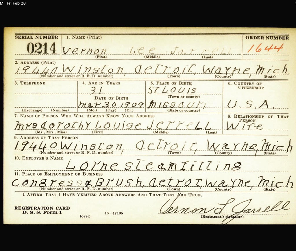 Vernon Lee Jarrell, World War II draft registration. He served in the U.S. Army from 1944-45 and was inducted at Fort Sheridan, Illinois, USA. He was wounded and captured in France in 1944 and was a prisoner of war in Germany. #falknerjarrell #wwii #wwiihistory #fortsheridan #illinois #jarrellgenealogy #jarrell #familyhistory #genealogy #familyarchives #familyarchive #usarmy #usarmyinfantry #militarymen #pow #prisonerofwar #france #france🇫🇷 #normandy #worldwar2 #worldwartwo #secondworldwar #militaryhistory #grandfather #grandpa #1940s #draftregistration #draftregistrationcard