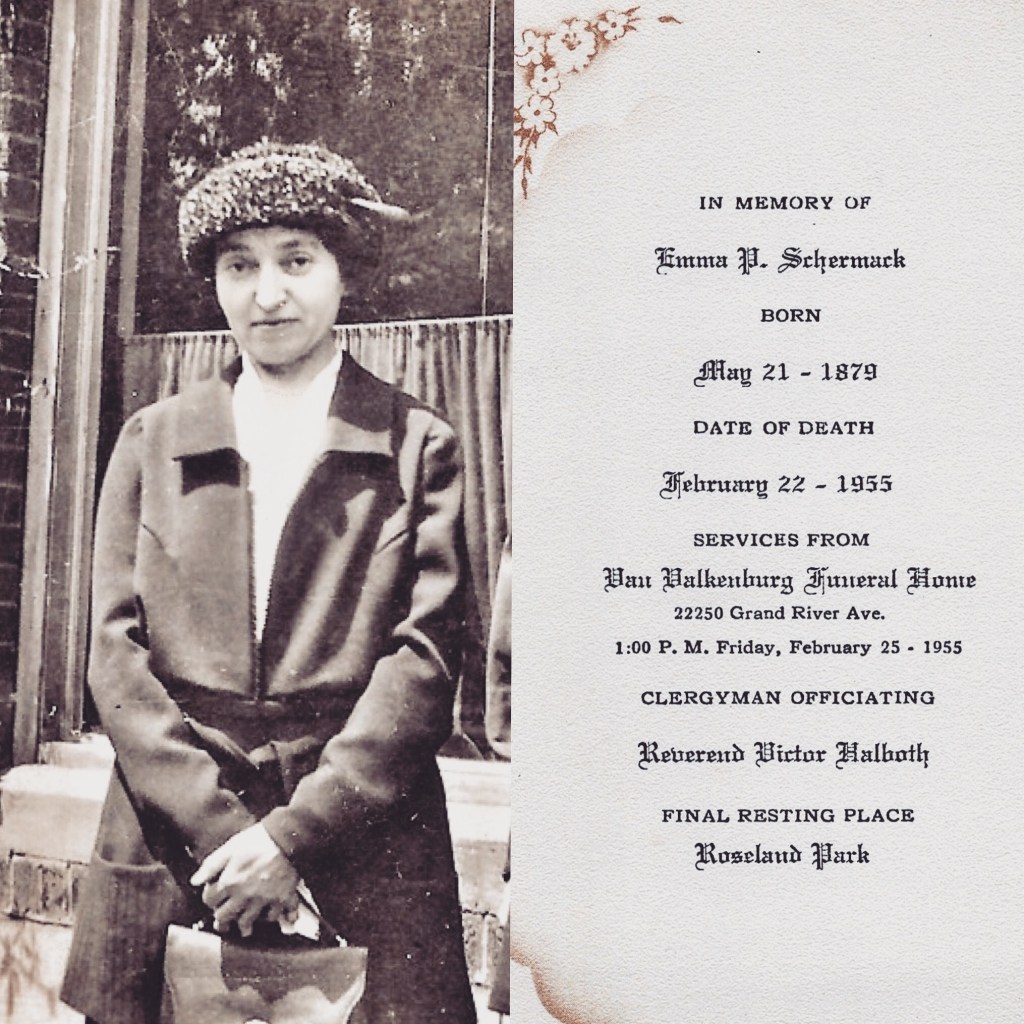 Memorial card for my great-great aunt, Emma Schermack. She was born in Freeport, Illinois, USA and migrated to Detroit, Michigan, USA, where she worked at the Schermack Company, for her inventor brother, Joseph J. Schermack, Jr.. She never married and maintained a residence in Detroit with her sisters, Anna Schermack and Alma Schermack Feneley. #falknerjarrell #schermackgenealogy #schermack #freeportillinois #illinois #detroit #detroitmichigan #familyhistory #genealogy #genealogia #genealogie #généalogie #familyphotos #oldphoto #oldphotos #illinoishistory #strongwomen #sisters #greatgreataunt #schermackcompanies #josephjschermack #funeral #memorialcard #funeralcard
