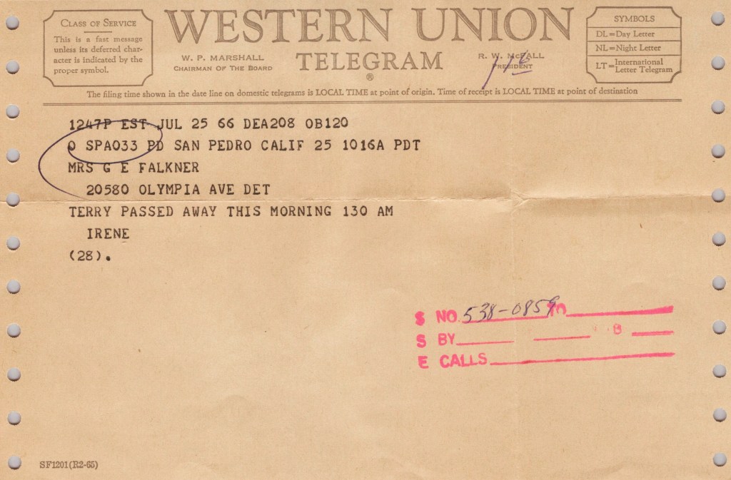 Telegram about the passing of Terence Patrick Carney (1966). He was a brother of my paternal grandmother, Agnes Carney Falkner. The family immigrated to Port Arthur, Ontario, Canada between 1910-1915 from Widnes, Lancashire, England. Terry relocated to San Pedro, California, USA. #falknerjarrell #ancestors #familyhistory #genealogy #genealogyphoto #ancestry #history #antiquephotograph #family #vintagephotography #oldphotos #oldphoto #ancestor #genealogyresearch #oldphotograph #savinghistory #findingroots #carneygenealogy #carney #canada #portarthur #ontario #thunderbay #thunderbayontario #widnes #meninhats #brothers #1920s #menincaps #irishgenealogy