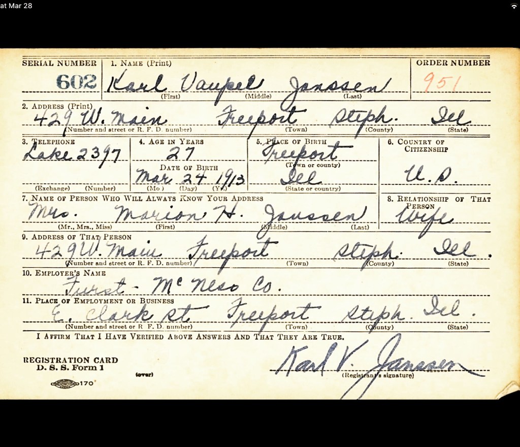 WWII draft registration of Karl Vaupel Janssen. He was the son of my great-grandfather’s (John William Blumenstiel) first cousin, Regina Vaupel Janssen. Her father, John Vaupel, founded the Vaupel Clothiers in Freeport, Illinois, USA. #falknerjarrell #vaupelgenealogy #vaupel #johnvaupel #johnvaupelclothier #janssen #janssengenealogy #familyhistory #genealogy #genealogyphoto #familyphotography #familyphoto #ancestors #ancestor #freeportillinois #illinois #oldphotos #oldphoto #antiquephoto #antiquephotograph #firstcousins #cousins #1900s #draft #draftregistration #ww2 #wwii