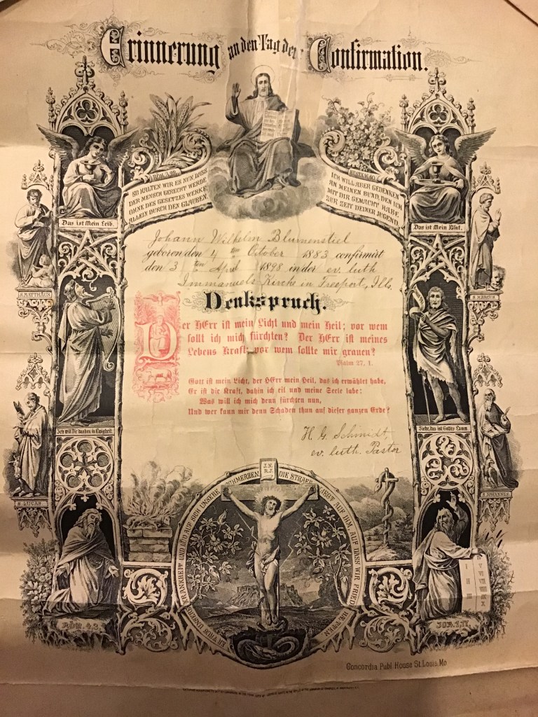 Confirmation certificate of John William (Johann Wilhelm) Blumenstiel, my great grandfather. He was confirmed at the Evangelical Lutheran Immanuels Church of Freeport, Illinois, USA in 1898 an the document is in German. #falknerjarrell #blumenstielgenealogy #blumenstiel #freeportillinois #illinois #illinoishistory #familyhistory #genealogy #familyphotos #ancestry #history #knowyouroots #antiquephotograph #family #vintagephotography #oldphotos #oldphoto #ancestor #antiquephoto #genealogyresearch #familytree #familyhistorian #findyourroots #traceyourroots #familyarchives #greatgrandfather #confirmation #evangelicallutheranchurch #lutheran #german