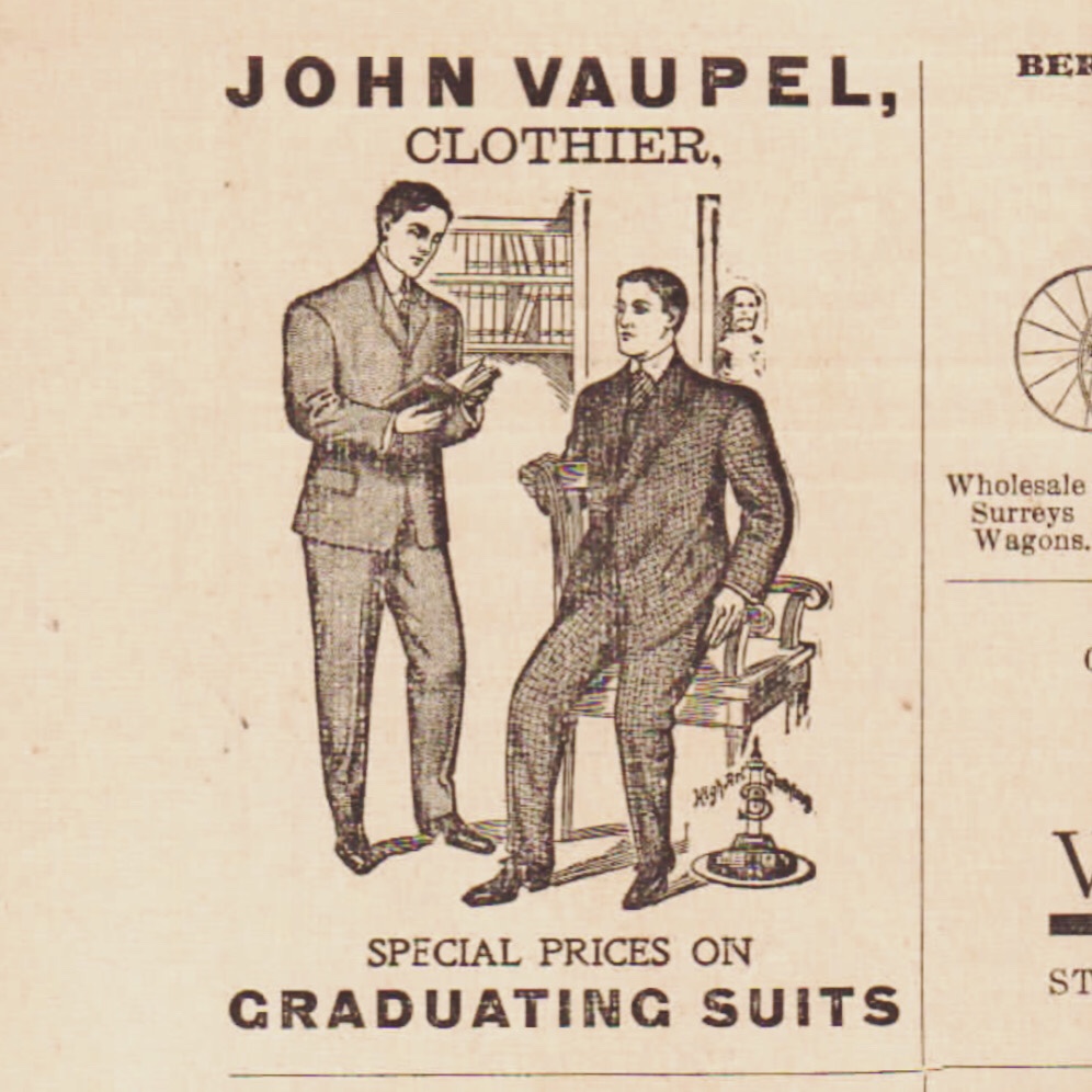 John Vaupel Clothier advertisement in the Freeport High School Polaris around 1905. The Vaupel Clothier was on Galena Street in Freeport, Illinois, USA. John Vaupel was the brother of my great-great grandmother, Christina Vaupel Blumenstiel, and my 3x great-uncle. #falknerjarrell #vaupelgenealogy #vaupel #blumenstielgenealogy #blumenstiel #genealogy #familyhistory #freeportillinois #freeportil #oldphotos #storefront #clothingstore #johnvaupel #johnvaupelclothier #advertising #vintageadvertising #gar #grandarmyoftherepublic #citydirectory #citydirectories #oldstore #oldstores #ancestors #ancestor #1900s #1900 #1905 #advertising #oldadvertising #polaris