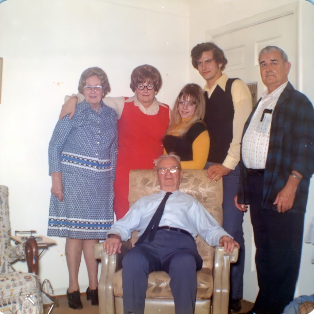 My great-grandfather, John William Blumenstiel (seated) with his son Donald’s family, early 1970s. Right to left: Donald Blumenstiel, William “Skip” Blumenstiel, Kathy Ryan Blumenstiel, Beatrice Wallace Blumenstiel, and Mrs. Wallace (Beatrice’s Mom). #falknerjarrell #blumenstielgenealogy #blumenstiel #familyhistory #genealogy #familyphotos #ancestry #history #knowyouroots #antiquephotograph #family #vintagephotography #oldphotos #oldphoto #ancestor #antiquephoto #genealogyresearch #familytree #familyhistorian #findyourroots #traceyourroots #genealogia #familyarchives #detroit #michigan #greatgrandfather #familyphotos #familyphoto