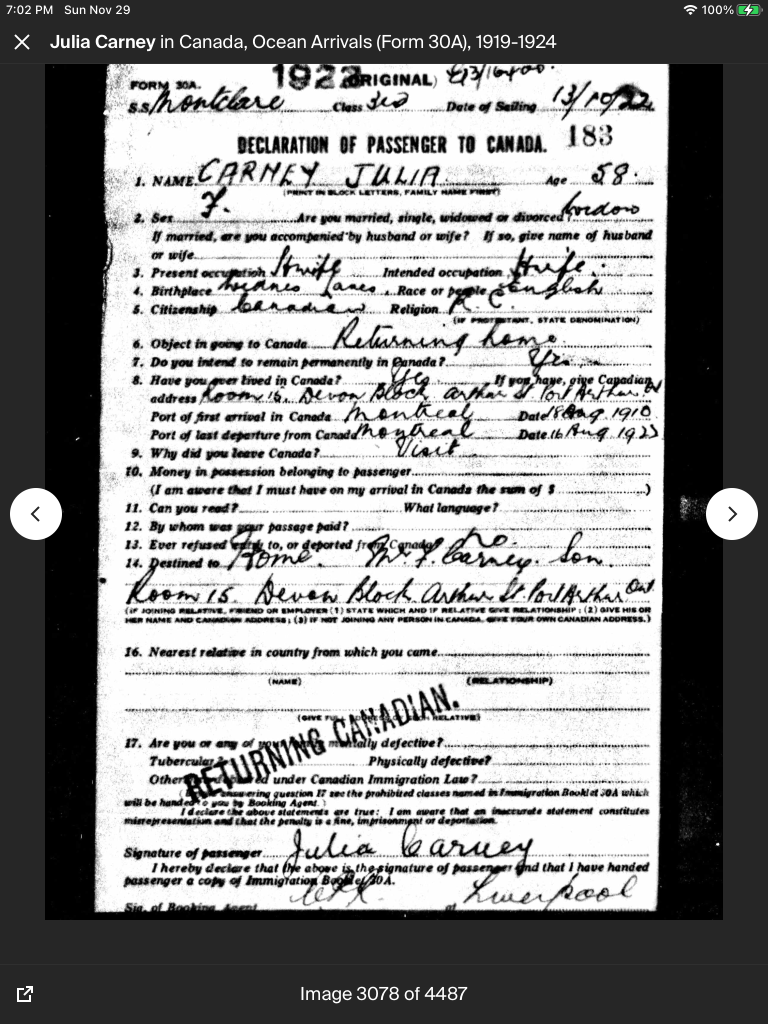 Passenger declaration for Julia Grady Carney, my paternal great-grandmother. She travelled from Canada to the UK and back in 1922. She was born in Widnes, Lancashire, England and immigrated to Canada in 1910. This pasenger declaration includes valuable information, such as her address in Port Arthur, Ontario, Canada (now called Thunder Bay) and the date of her first arrival in Canada. #falknerjarrell #carneygenealogy #carney #ancestors #familyhistory #genealogy #genealogyphoto #falknerjarrell #ancestry #history #knowyouroots #family #oldphoto #ancestor #genealogyresearch #familytree #familyhistorian #findyourroots #traceyourroots #genealogia #familyarchives #savinghistory #findingroots #widnes #lancashire #portarthurontario #thunderbay #thunderbayontario #passengerdeclarationform #immigration #traveldocuments