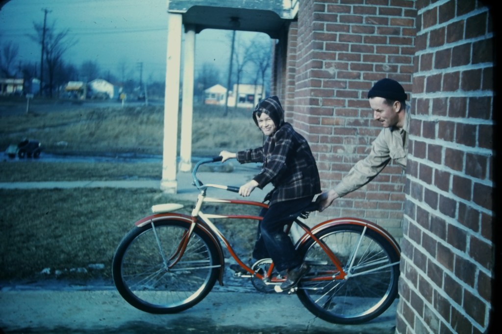 My grandfather, George Ernest Falkner, Jr., supporting my father, Patrick, on an adult bike in the 1940s. I think the bike was my grandfather’s Christmas present. Scanned from a Kodachrome color slide. Redford, Michigan, USA. #falknerjarrell #falknergenealogy #falkner #ancestors #familyhistory #genealogy #genealogyphoto #ancestry #history #knowyouroots #family #vintagephotography #genealogyresearch #vintagephoto #savinghistory #findingroots #children #1940s #savefamilyphotos #savefamilymemories #redfordmi #redfordmichigan #michigan #familyphotography #familyphotos #fatherandson #father #fatherandson #child #kodachrome #bike