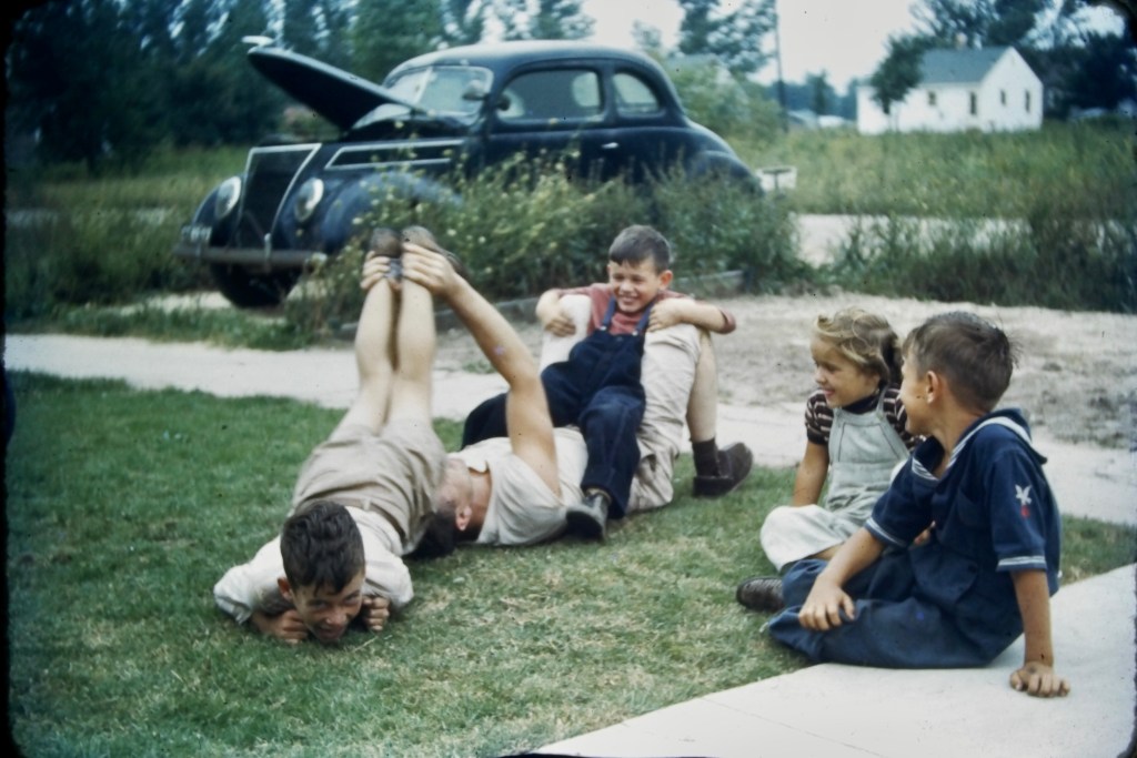My grandfather, George Ernest Falkner, Jr., playing with my father, Patrick, seated on him and my uncle, Ronald, lying down, in the 1940s. Neighborhood children, at right, watch the scene. Scanned from a Kodachrome color slide. Redford, Michigan, USA. #falknerjarrell #falknergenealogy #falkner #ancestors #familyhistory #genealogy #genealogyphoto #ancestry #history #knowyouroots #family #vintagephotography #genealogyresearch #vintagephoto #savinghistory #findingroots #children #1940s #savefamilyphotos #savefamilymemories #redfordmi #redfordmichigan #michigan #familyphotography #familyphotos #fatherandson #father #fatherandsons #kodachrome #1940s