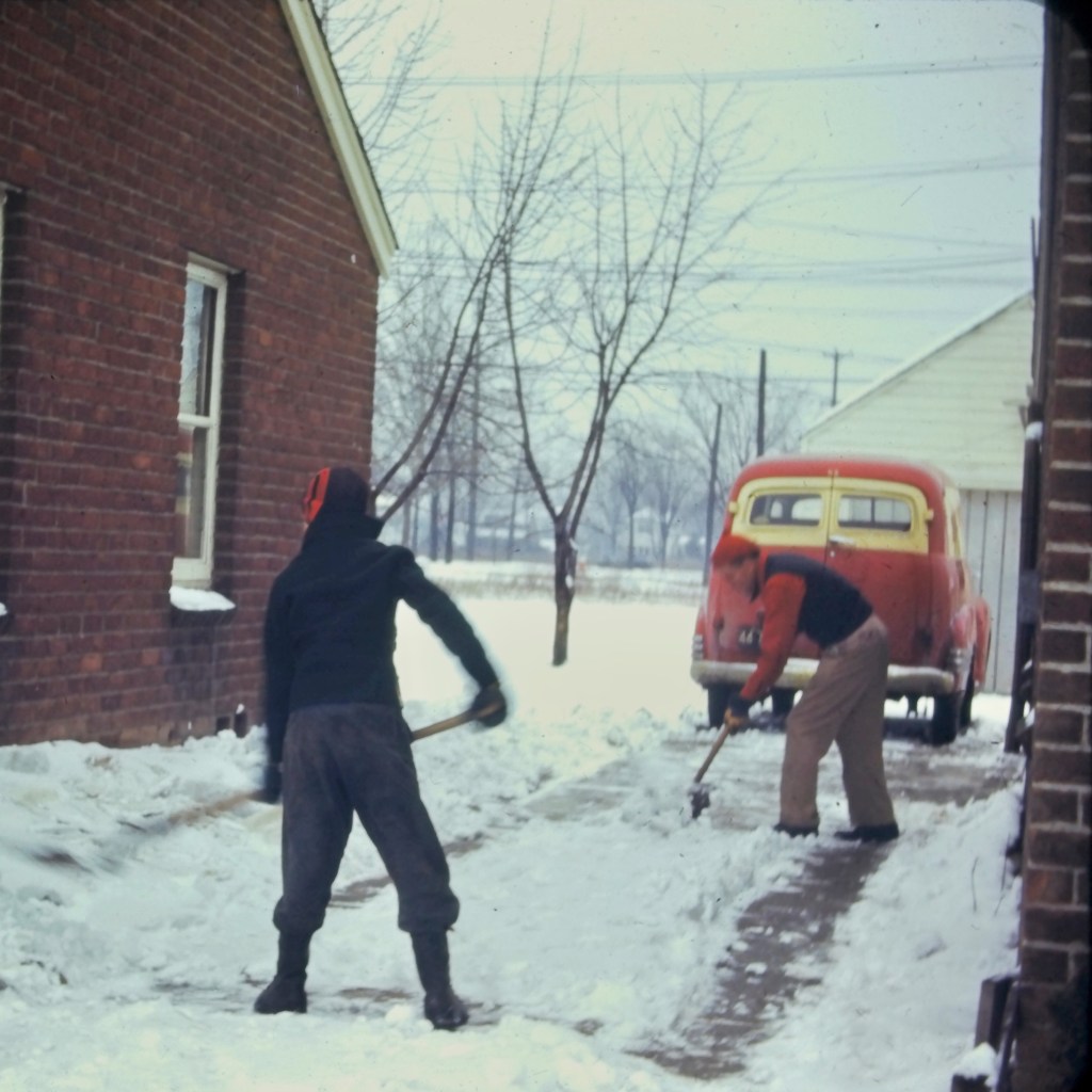 My grandfather, George Ernest Falkner, Jr., and Uncle, Ronald Holmes, shoveling snow on Seminole St., Redford, Michigan, USA in the 1940s. Scanned from a Kodachrome color slide. Redford, Michigan, USA. #falknerjarrell #falknergenealogy #falkner #ancestors #familyhistory #genealogy #genealogyphoto #ancestry #history #knowyouroots #family #vintagephotography #genealogyresearch #vintagephoto #findingroots #1940s #savefamilyphotos #redfordmi #redfordmichigan #michigan #familyphotography #familyphotos #kodachrome #chevy #vintagechevy #deliverytruck #antiquecar #vintagecar #snow #shovelingsnow