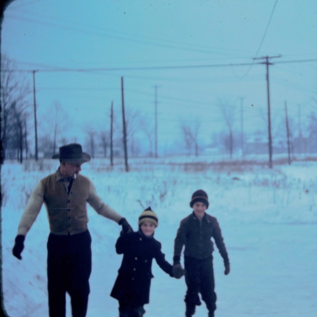 My father, Patrick Falkner (center), ice skating with his father, George Ernest Falkner, Jr., and brother, Ronald Falkner, on Seminole St., Redford, Michigan, USA in the 1940s. Scanned from a Kodachrome color slide. Redford, Michigan, USA. #falknerjarrell #falknergenealogy #falkner #ancestors #familyhistory #genealogy #genealogyphoto #ancestry #history #knowyouroots #family #vintagephotography #genealogyresearch #vintagephoto #findingroots #1940s #savefamilyphotos #redfordmi #redfordmichigan #michigan #familyphotography #familyphotos #kodachrome #snow #shovelingsnow #snowday #winter #bundledup #skating #iceskating