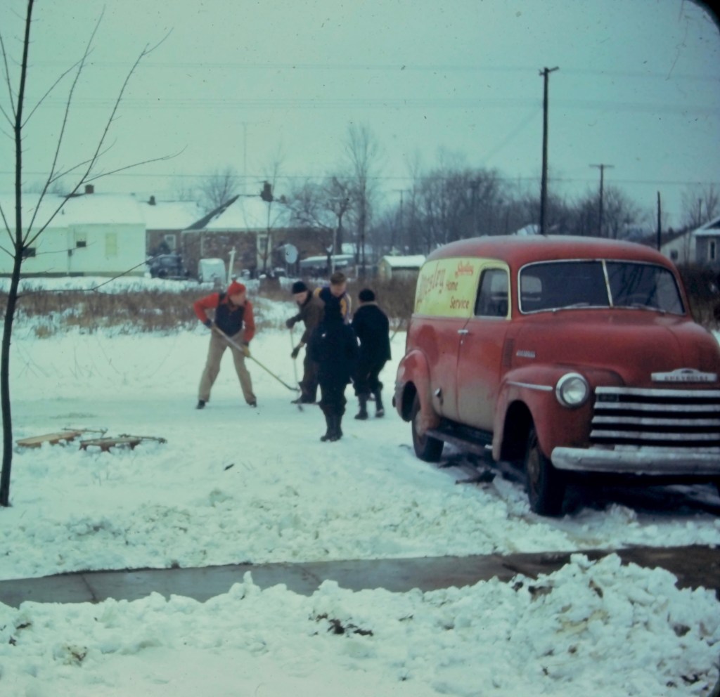 My grandfather, George Ernest Falkner, Jr. (red hat) and companions playing hockey on a homemade rink on Seminole St., Redford, Michigan, USA in the 1940s. Scanned from a Kodachrome color slide. Redford, Michigan, USA. #falknerjarrell #falknergenealogy #falkner #ancestors #familyhistory #genealogy #genealogyphoto #ancestry #history #knowyouroots #vintagephotography #genealogyresearch #vintagephoto #findingroots #1940s #redfordmi #redfordmichigan #michigan #familyphotography #familyphotos #kodachrome #chevy #vintagechevy #deliverytruck #antiquecar #vintagecar #snow #hockey #hockeyathome #hockeyrink