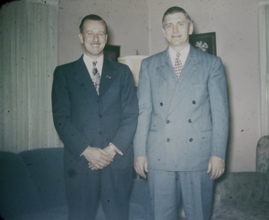 My grandfather, George Ernest Falkner, Jr. (left) and a friend in the 1940s. Scanned from a Kodachrome color slide. Detroit, Michigan, USA. #falknerjarrell #falknergenealogy #falkner #ancestors #familyhistory #genealogy #genealogyphoto #ancestry #history #knowyouroots #family #vintagephotography #genealogyresearch #vintagephoto #findingroots #1940s #savefamilyphotos #savefamilymemories #redford #redfordmi #redfordmichigan #michigan #familyphotography #familyphotos #grandfather #grandpa #kodachrome #meninsuits