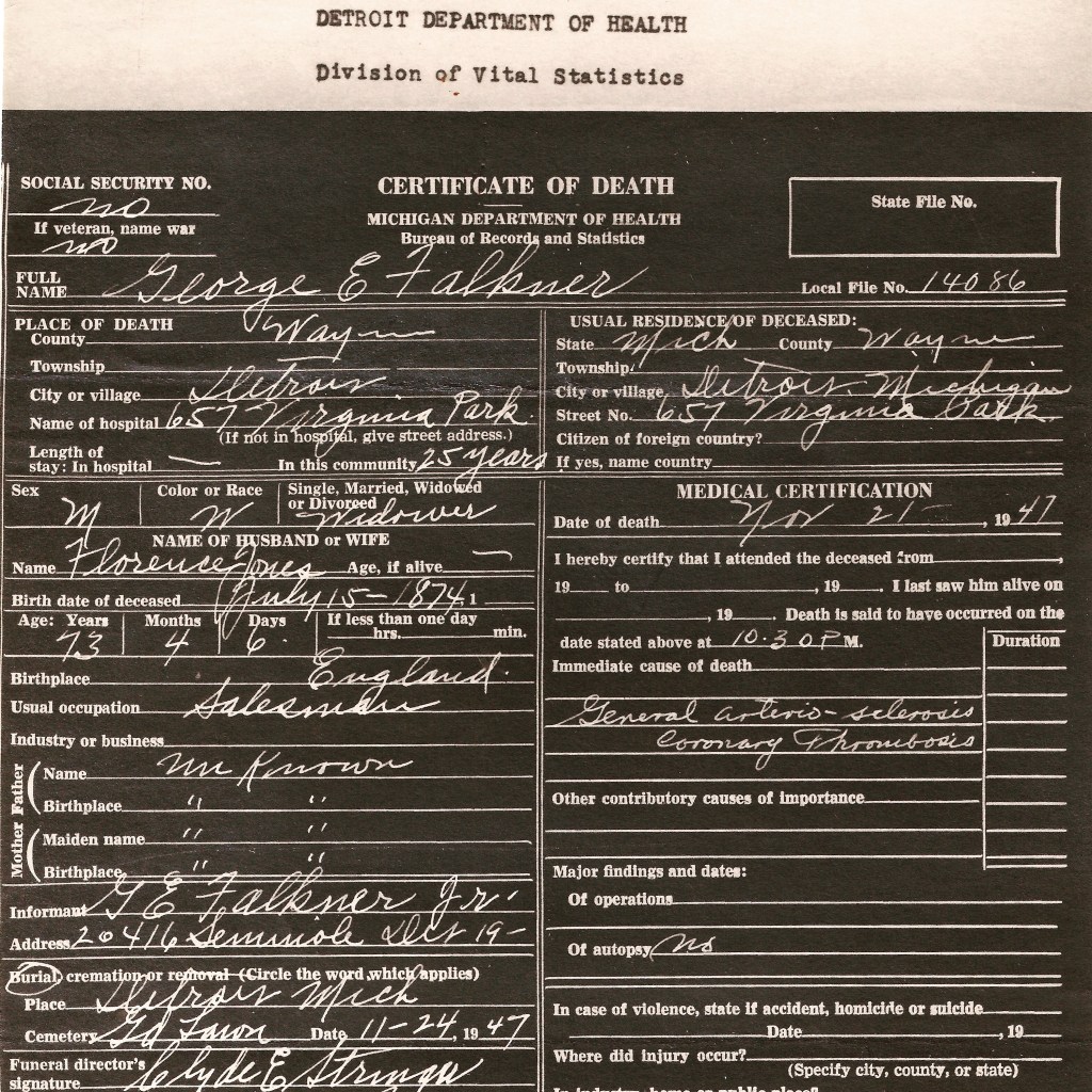 Death certificate for my great-grandfather, George Ernest Falkner, Sr. He died inDetroit, Michigan, USA in 1947. #falknerjarrell #ancestors #familyhistory #genealogy #genealogyphoto #ancestry #knowyouroots #family #vintagephotography #oldphotos #oldphoto #ancestor #antiquephoto #genealogyresearch #oldphotograph #savinghistory #findingroots #falknergenealogy #falkner #detroit #michigan #redfordmi #1940s #grandfather #greatgrandfather #greatgrandparents #deathcertificate #death #deathnotice