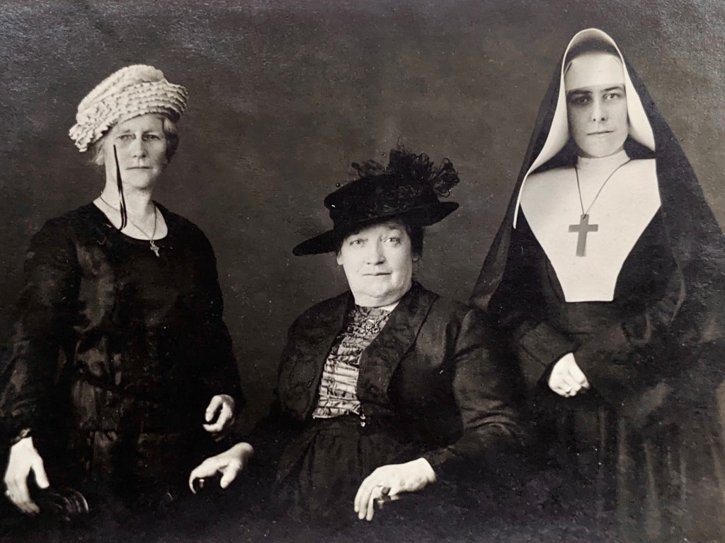 Julia Grady Carney (my paternal great-grandmother, at left) and friend (Annie?) visited her daughter, Sister St Edmund (Kathleen Carney), in the UK in the late 1910s/1920s. Julia and the rest of her children had moved to Port Arthur, Ontario, Canada between 1911-1915, without her husband, Thomas Carney, who remained in Widnes, UK. #falknerjarrell #ancestors #familyhistory #genealogy #genealogyphoto #falknerjarrell #ancestry #history #knowyouroots #antiquephotograph #family #vintagephotography #oldphoto #ancestor #antiquephoto #genealogyresearch #familytree #familyhistorian #findyourroots #traceyourroots #genealogia #familyarchives #oldphotograph #savinghistory #findingroots #carney #carneygenealogy #widnes #lancashire #grady #gradygenealogy